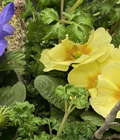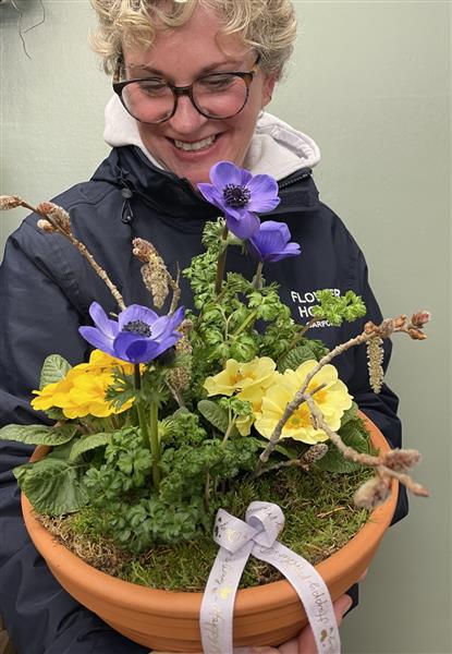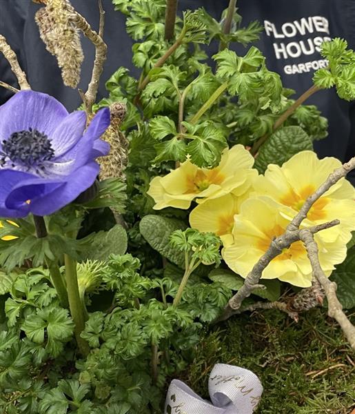 Fresh planted arrangement featuring Primulas, Anemones, Moss and decorative Katkins.