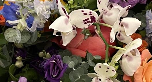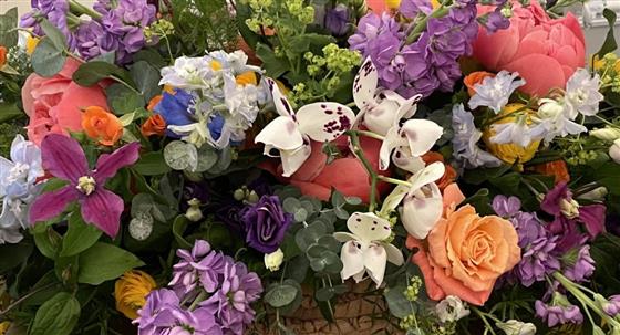 A selection of seasonal flowers arranged with foliages in a basket, including Roses, Stocks, Lisianthus and other complementary flowers.