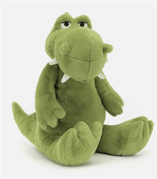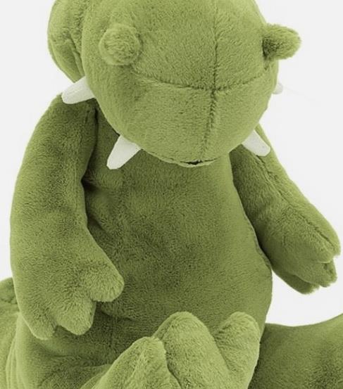 Take a seat next to Bryno Dino and watch the world go by. This apple-green dino is bold and eccentric, with a bobbly brow, knobbled nostrils, suedette tusks and huge squashy feet, not to mention that wedge tail embroidered with spines.