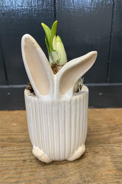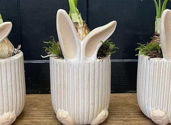A trio of ceramic bunny ear pots featuring a Tete a Tete bulb in each bunny.