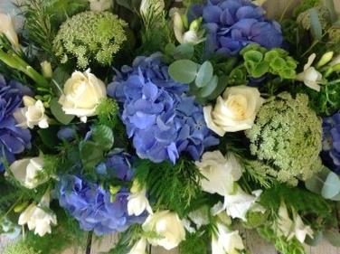 Featuring beautiful summer flowers of Blue hydrangeas,white Roses, white Freesia, white Lisianthus, contrasted with a selection of seasonal foliages.