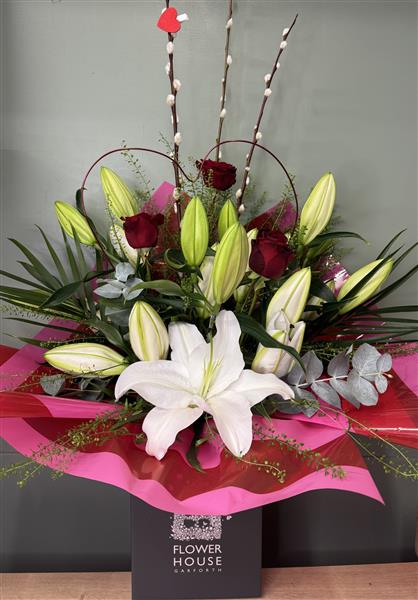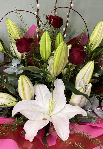 White Orientals, red Roses, Pussy Willow and foliages arranged as a hand tied presented in our signature grey aqua pack box.