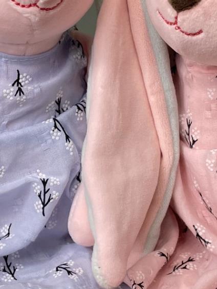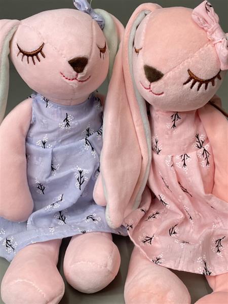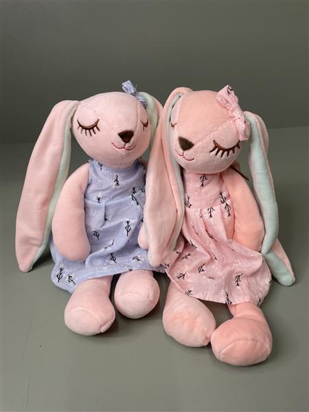 Due Flopsy Bunny in shades of soft pink. Long floppy pink and mint green ears, decorated with a blue and pink cotton dresses.