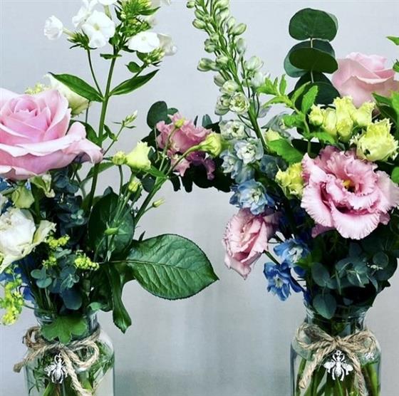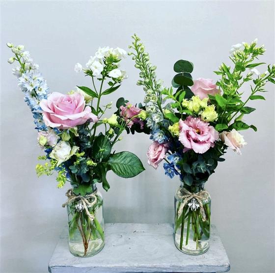 A duo of jars filled with pink Roses, white Phlox, blue Delphinium, pink Lisianthus and foliage to create a cottage vibe.