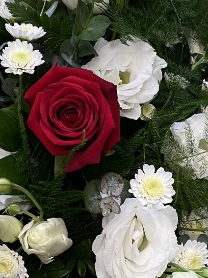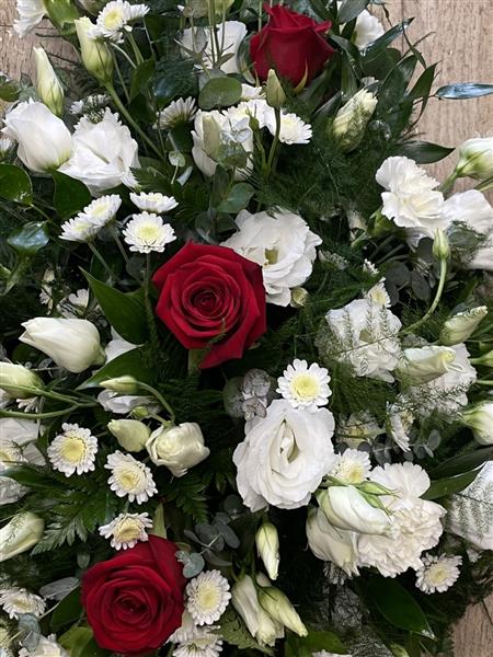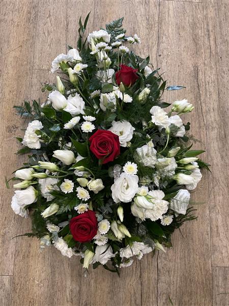 Teardrop spray with red Roses, and a selection of seasonal white flowers, such as Lisianthus and Chrysanthemums. Featuring soft delicate foliages.