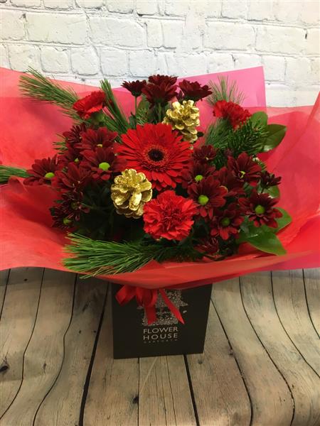 Gerbera, Carnations and Chrysanthemums with seasonal foliages, arranged as a hand tied presented in our signature grey aqua pack box.