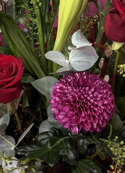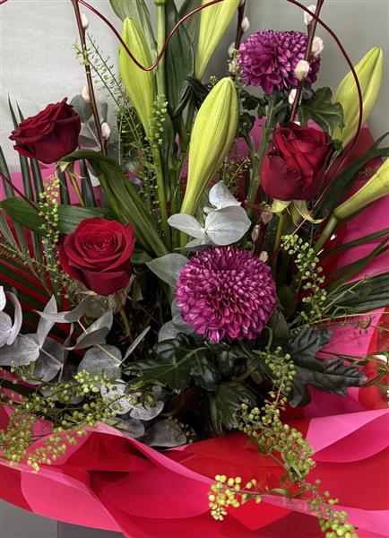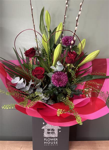 White Longi Lilies, red Roses, Chrysanthemum Blooms and Pussy Willow with complimentary foliages arranged as a hand tied presented in our signature grey aqua pack box.