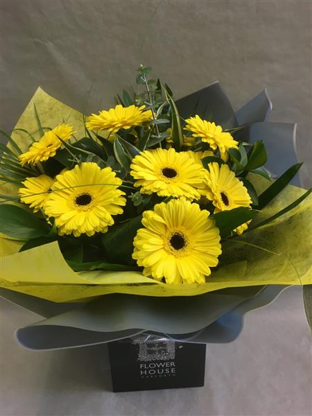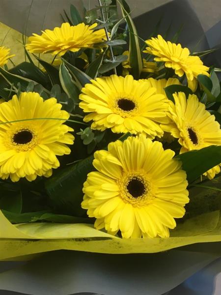 Gerbera's and foliage arranged as a hand tied presented in our signature grey aqua pack box.