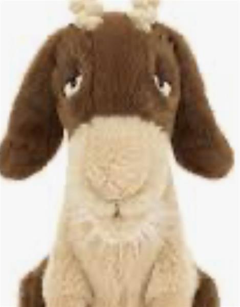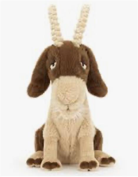 Glenny Goat is the cuddliest kid in the herd. In tan and brown fur, Glenny has thick cord horns and a fluffy cream beard and tail. With expressive, hooded eyes and a sleepy, stitched smile, Glenny is the perfect cuddling companion.