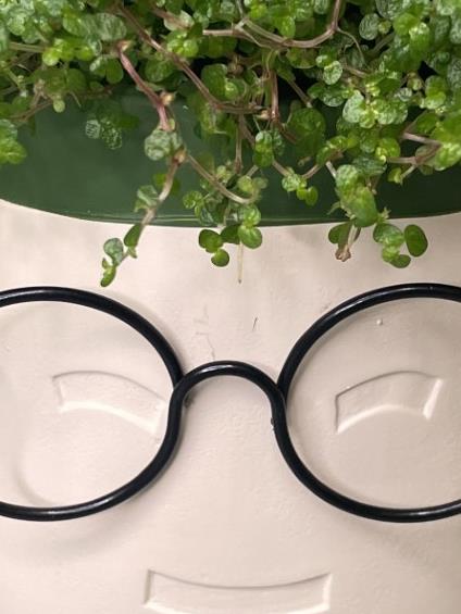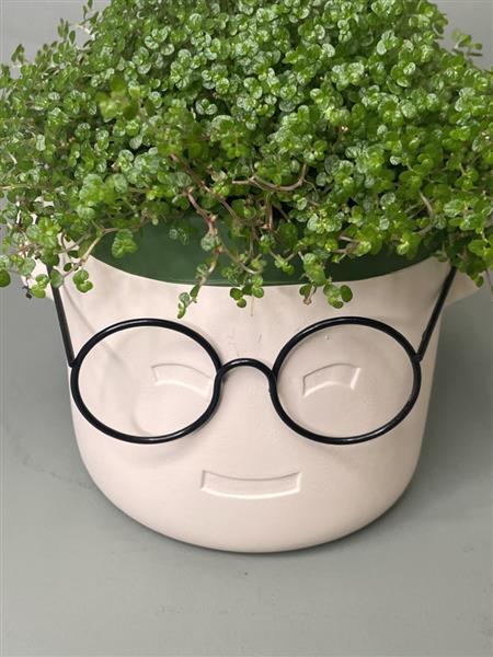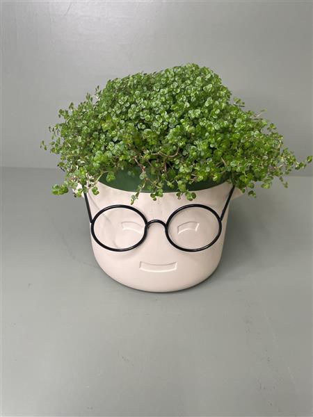 Fresh green Helxine plant placed in a ceramic cream face plant pot, with black metal frame glasses with a green edge.