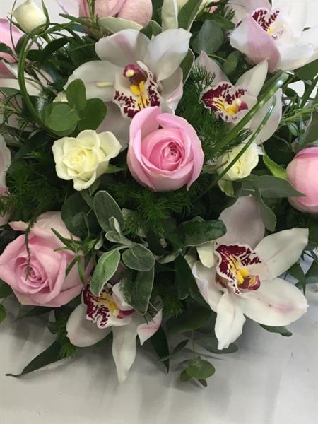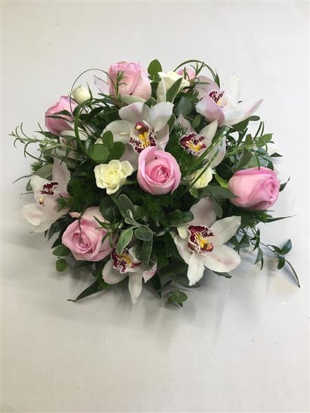 This Orchid and Rose posy arrangement is lovingly created by one of our skilled florists using pale pink Roses and Cymbidium Orchids.