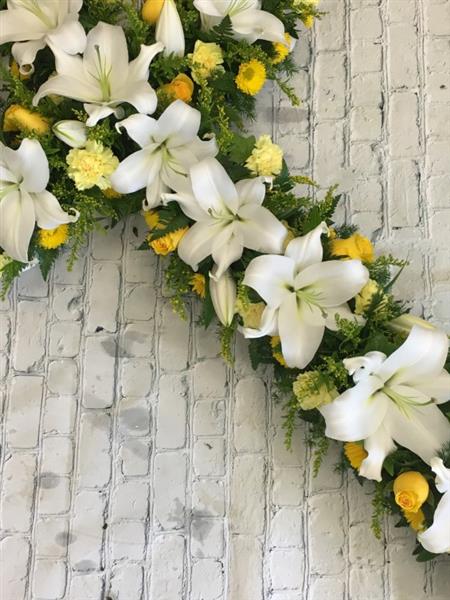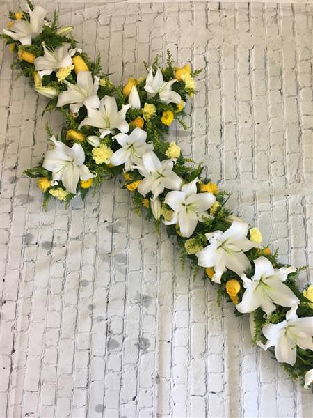 Purity and Peace Cross created with white Oriental Lilies, yellow Roses, yellow Carnations and foliages.