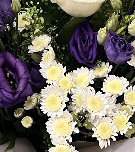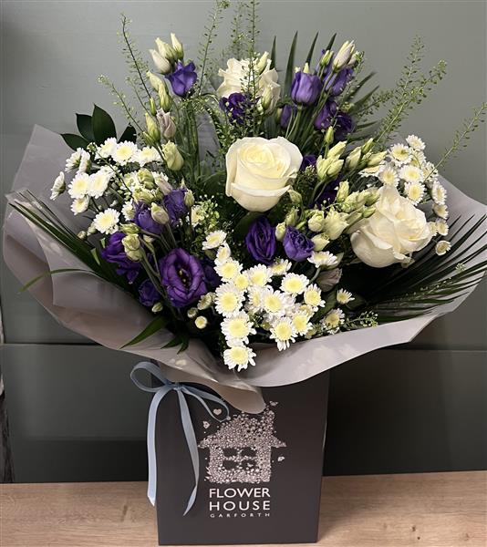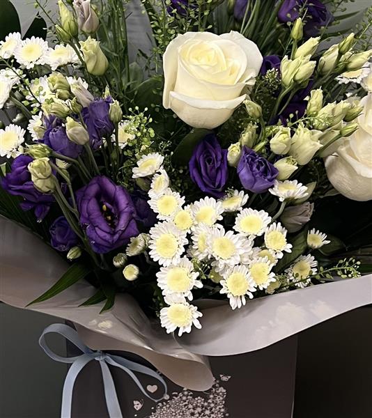 Romeo Hand Tied including Purple Lisianthus, White Roses, White Stallion Chrysanthemums and foliages, presented in our signature grey aqua pack box.