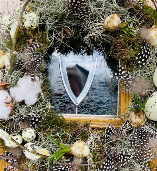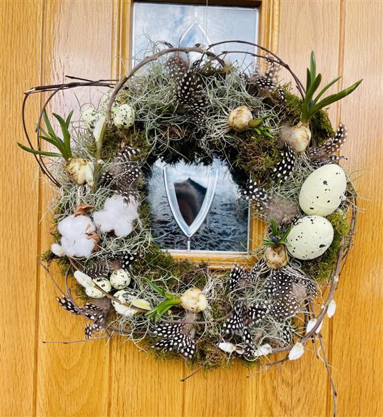 This door wreath is designed on a 12inch frame using a selection of different mosses, decorative eggs, Guineafowl feathers and fresh spring bulbs. A perfect welcome.