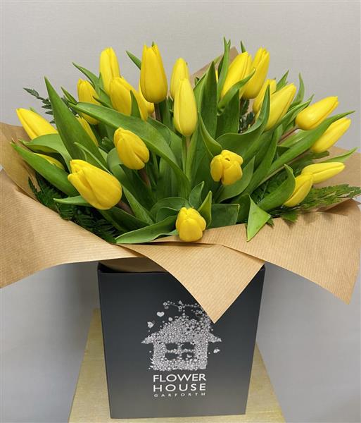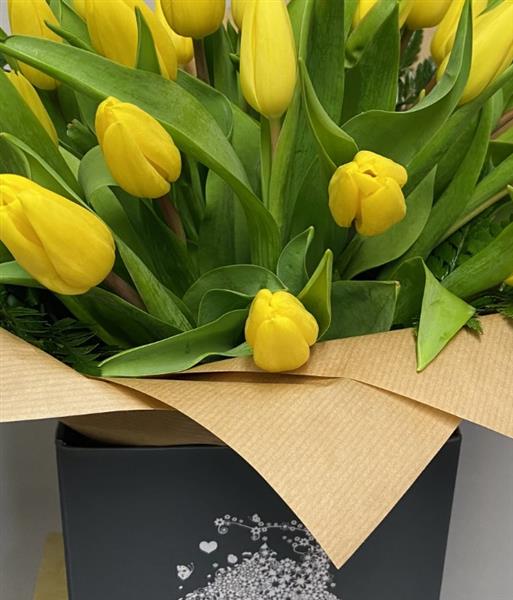 Yellow tulips and foliage arranged as a hand tied presented in our signature grey aqua pack box.