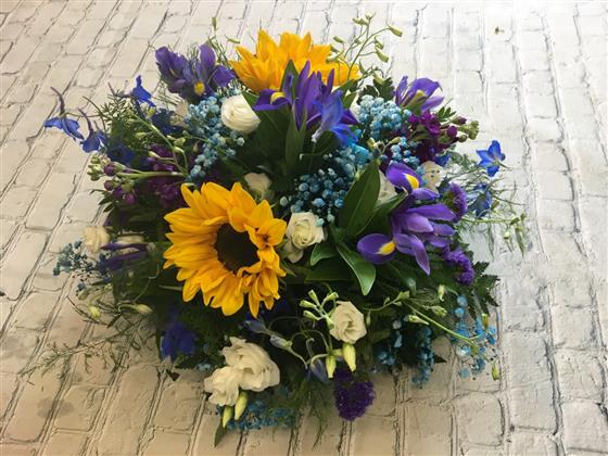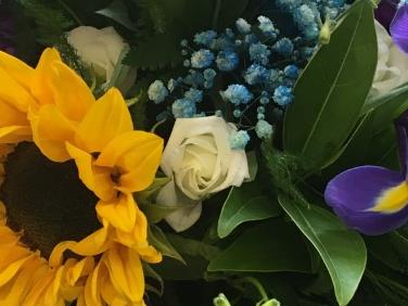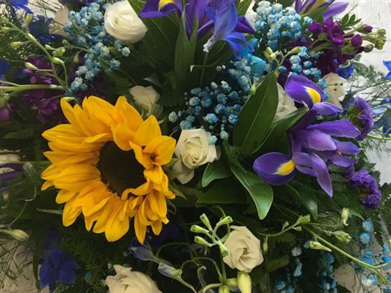 Sunflowers and Iris arranged with complimentary flowers and foliages as a posy arrangement.