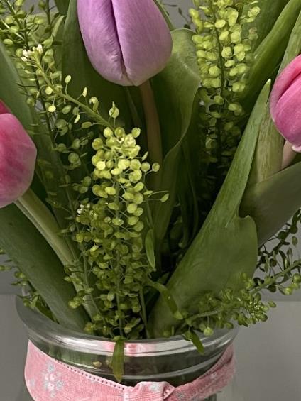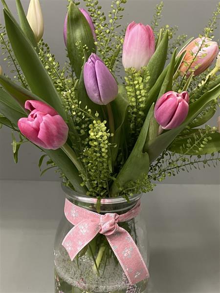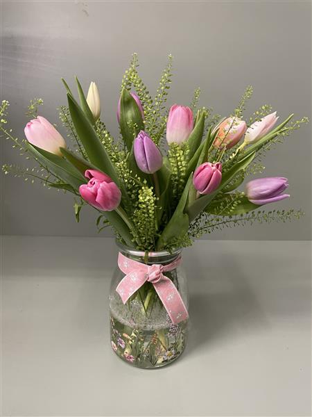 Fresh mixed coloured Tulips arranged in a beautiful floral decorative thick glass vase, finished with a floral ribbon bow.