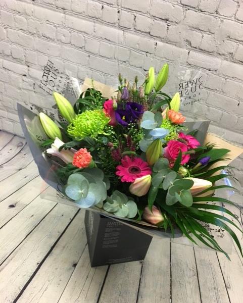 A selection of seasonal vibrant flowers arranged as a hand tied presented in our signature grey aqua pack box.