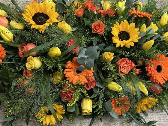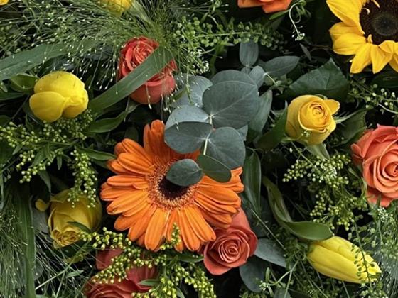 A selection of yellow and orange flowers, including Gerberas, Sunflowers, Roses and other flowers with complementary foliages.