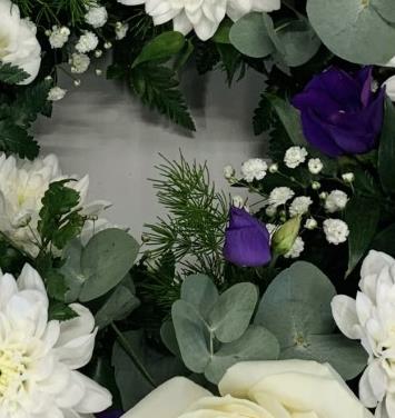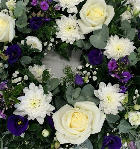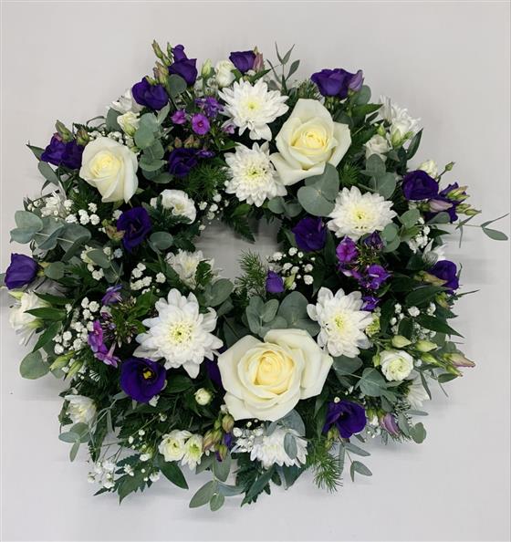 Purple and white Wreath including white Roses, purple Lisianthus and other complimentary flowers with soft foliages.