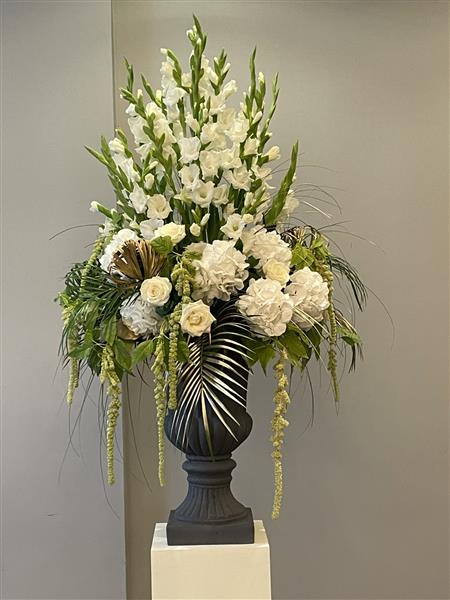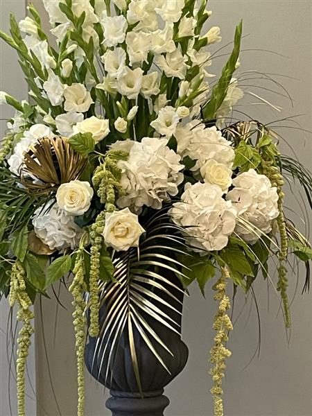 A selection of white flowers with foliages sprayed gold, featuring Gladioli, Hydrangea and Roses.